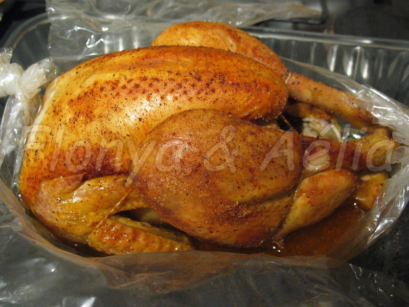 Essuyer votre poulet et le masser sur tout la surface avec un mélange de sel, poivre, 5 épices et paprika, mettez le dans le milieu du sachet cuisson au four nouer de chaque coté en ayant pris soin de faire entrer plein d’air, faite quelques trous avec une aiguille sur le dessus du sachet et enfourner à 220° pour 1 heure.